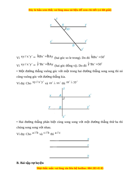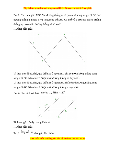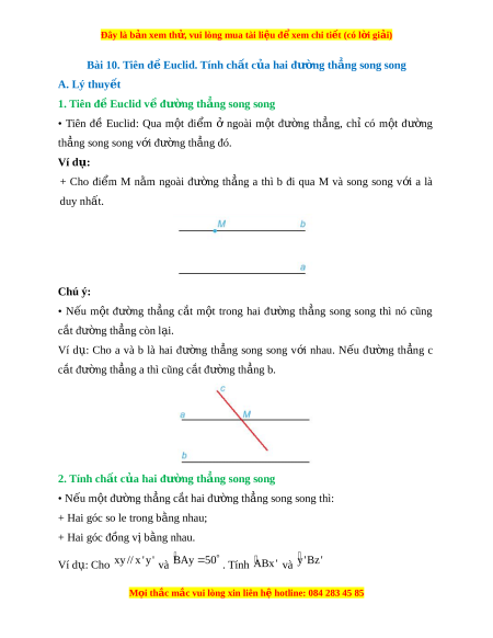 Đây là bản xem th , vu ử i lòng mua tài li u ệ đ xe ể m chi ti t (c ế ó l i ờ gi i ả ) Bài 10. Tiên đ E ề uclid. Tính ch t ấ c a hai ủ đư ng ờ th ng s ẳ ong song A. Lý thuy t ế 1. Tiên đ E ề uclid v đ ề ư ng t ờ h ng s ẳ ong song