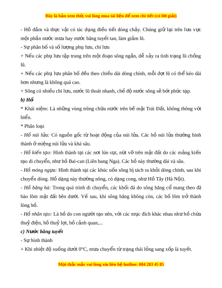 Đây là bản xem th , vu ử i lòng mua tài li u ệ đ xe ể m chi ti t ế (có l i ờ gi i ả ) - Hồ đ m ầ và th c ự v t ậ có tác d ng ụ đi u ề ti t ế dòng ch y ả . Chúng giữ l i ạ trên l u ư v c ự m t ộ phần nư c ớ m a hay n ư ư c ớ băng tuy t ế tan, làm gi m ả lũ. - S phân b ự ố và số lư ng ph ợ ụ l u, chi ư l u ư + N u ế các phụ l u ư t p ậ trung trên m t ộ đo n ạ sông ng n, ắ d ễ x y ả ra tình tr ng ạ lũ ch ng ồ lũ. + N u ế các phụ l u ư phân bố đ u ề theo chi u ề dài dòng chính, m i ỗ đ t ợ lũ có th ể kéo dài h n ơ nh ng l ư à không quá cao. + Sông có nhi u chi ề l u, n ư ư c ớ lũ thoát nhanh, ch đ ế n ộ ư c s ớ ông s b ẽ t ớ ph c ứ t p. ạ b) Hồ * Khái ni m ệ : Là nh ng ữ vùng trũng ch a ứ nư c ớ trên b ề m t ặ Trái Đ t ấ , không thông v i ớ bi n. ể * Phân lo i ạ - Hồ núi l a: ử Có ngu n ồ g c ố từ ho t ạ đ ng ộ c a ủ núi l a. ử Các hồ núi l a ử thư ng ờ hình thành ở mi ng núi ệ l a và ử khá sâu. - Hồ ki n ế t o: ạ Hình thành t i ạ các n i ơ lún s t ụ , n t ứ vỡ trên m t ặ đ t ấ do các m ng ả ki n ế t o ạ di chuy n, nh ể h