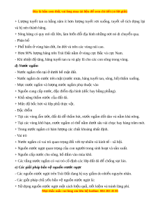 ế tan ra và gây lũ cho các con sông trong vùng. d) Nư c ng ớ ầm - Nư c ớ ng m ầ t n t ồ i ạ d ở ư i ớ b m ề t ặ đ t ấ . - Nư c ớ ng m ầ do nư c ớ trên m t ặ (nư c ớ m a, băng t ư uy t ế tan, sông, h ) ồ th m ấ xu ng. ố - M c ự nư c ng ớ m ầ và lư ng n ợ ư c ớ ng m ầ ph t ụ hu c vào ộ + Nguồn cung c p n ấ ư c, ớ đ c đi ặ m ể đ a hì ị nh (d c ố hay b ng ph ằ ng) ẳ . + Khả năng th m ấ nư c c ớ a ủ đ t ấ đá. + M c ứ đ b ộ ốc h i ơ và l p ớ ph t ủ h c v ự t ậ . - Đ c ặ đi m ể + T i ạ các vùng m ẩ ư t ớ , đ t ấ đá d t ễ h m ấ hút, nư c ng ớ m ầ d i ồ dào và n m ằ khá nông. + T i ạ các vùng khô h n, ạ nư c ng ớ m ầ có th n ể m ằ dư i ớ sâu vài ch c hay hàng t ụ răm mét. + Trong nư c ng ớ m ầ có hàm lư ng ợ các ch t ấ khoáng nh t ấ đ nh. ị - Vai trò + Nư c ớ ng m ầ có vai trò quan tr ng đ ọ i ố v i ớ t nhi ự ên và kinh t - ế xã h i ộ . + Nguồn nư c ớ ng t ọ quan tr ng ọ c a con ng ủ ư i ờ trong sinh ho t ạ và s n ả xu t ấ . + Nguồn c p n ấ ư c cho ớ sông, h đ ồ m ầ vào mùa khô. + Các t ng n ầ ư c ng ớ m ầ có vai trò c đ ố nh các ị l p đ ớ t ấ đá đ ch ể ng s ố t ụ lún. e) Các gi i ả pháp b o v ả ngu ệ n n ồ ư c ng ớ t ọ - Các nguồn nư c ớ ng t ọ trên Trái Đ t ấ đang b s ị uy gi m ả do nhi u nguyên nhân. ề - Các gi i ả pháp ch y ủ u ế b o v ả ngu ệ n n ồ ư c ng ớ t ọ là: + S d ử ng ngu ụ ồn nư c ớ ng t ọ m t ộ cách hi u qu ệ , ả ti t ế ki m ệ và tránh lãng phí. M i