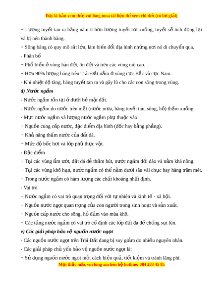 Đây là bản xem th , vu ử i lòng mua tài li u ệ đ xe ể m chi ti t ế (có l i ờ gi i ả ) + Lư ng ợ tuy t ế tan ra h ng ằ năm ít h n ơ lư ng ợ tuy t ế r i ơ xu ng, ố tuy t ế sẽ tích đ ng ọ l i ạ và bị nén thành băng. + Sông băng có quy mô r t ấ l n, l ớ àm bi n đ ế i ổ đ a hì ị nh nh ng n ữ i ơ nó di chuy n ể qua. - Phân bố + Ph bi ổ n ế vùng hàn đ ở i ớ , ôn đ i