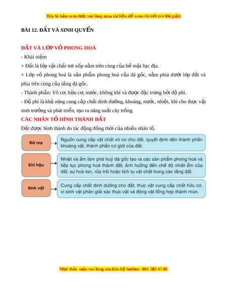 BÀI 12. ĐẤT VÀ SINH QUY N Ể ĐẤT VÀ L P Ớ V P Ỏ HONG HOÁ - Khái ni m ệ + Đất là l p v ớ t ậ ch t ấ t i ơ x p n ố m ằ trên cùng c a ủ b m ề t ặ l c ụ đ a. ị + L p ớ vỏ phong hoá là s n ả ph m ẩ phong hoá c a ủ đá g c, ố n m ằ phía dư i ớ l p ớ đ t ấ và phía trên cùng c a ủ t ng đá ầ g c. ố - Thành ph n: ầ Vô c , ơ h u c ữ , n ơ ư c, ớ không khí và đư c ợ đ c t ặ r ng b ư i ở đ phì ộ .