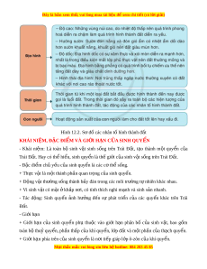 ơ ồ các nhân tố hình thành đ t ấ KHÁI NI M, Đ Ệ C Ặ ĐI M Ể VÀ GI I Ớ H N Ạ C A Ủ SINH QUY N Ể - Khái ni m ệ : Là toàn bộ sinh v t ậ sinh s ng ố trên Trái Đ t ấ , t o ạ thành m t ộ quy n ể c a ủ Trái Đất. Hay có th hi ể u, s ể inh quy n l ể à th gi ế i ớ c a s ủ inh v t ậ s ng t ố rên Trái Đ t ấ . - Đ c ặ đi m ể ch y ủ u c ế a ủ sinh quy n l ể à các c t ơ h s ể ng. ố + Th c ự v t ậ là m t ộ thành ph n quan t ầ r ng c ọ a s ủ inh quy n. ể + Đ ng ộ v t ậ thư ng s ờ ng t ố hành b y đàn t ầ rong các môi trư ng t ờ nhi ự ên khác nhau. + Vi sinh v t ậ có m t ặ kh ở p n ắ i