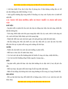 ụ mét ở phía trên và dư i ớ bề m t ặ đất. CÁC NHÂN TỐ N Ả H HƯ N Ở G Đ N Ế SỰ PHÁT TRI N Ể VÀ PHÂN BỐ SINH VẬT KHÍ HẬU - S ự phát tri n ể và phân b c ố a ủ sinh v t ậ ch u t ị ác đ ng ộ tr c ự ti p ế c a ủ ánh sáng, nhi t ệ đ , ộ độ m ẩ không khí. - Ánh sáng: Đi u ề ki n ệ sinh t n ồ quan tr ng ọ b c ậ nh t ấ c a ủ cây xanh, nh ờ có ánh sáng mà cây xanh m i ớ th c hi ự n đ ệ ư c quá ợ trình quang h p. ợ - Nhi t ệ đ : ộ Mỗi loài sinh v t ậ thích nghi v i ớ m t ộ gi i ớ h n nhi ạ t ệ đ nh ộ t ấ đ nh. ị - Độ m ẩ không khí: R t ấ c n ầ thi t ế cho sinh v t ậ . H u ầ h t ế các sinh v t ậ trên Trái Đ t ấ đ u khó t ề ồn t i ạ và phát tri n t ể rong môi trư ng r ờ t ấ khô h n. ạ NƯ C Ớ - Nư c ớ r t ấ c n t ầ hi t ế cho sinh v t ậ sinh trư ng và phát ở tri n. ể - Mỗi loài có nhu c u v ầ n ề ư c ớ khác nhau. + Các loài sinh v t ậ a ư m ẩ thư ng phân b ờ nhi ố u ề vùng xí ở ch đ o, ạ nhi t ệ đ i ớ m ẩ ,... + Các loài a khô t ư hư ng ờ s ng ố t ở h o nguyên, ả hoang m c,... ạ ĐẤT - Sự phát tri n, ể phân bố th c ự v t ậ ch u ị nh ả hư ng ở từ các đ c