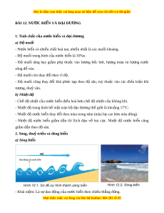 Đây là bản xem th , vu ử i lòng mua tài li u ệ đ xe ể m chi ti t ế (có l i ờ gi i ả ) BÀI 12. NƯ C Ớ BI N Ể VÀ Đ I Ạ DƯ N Ơ G 1. Tính ch t ấ c a n ủ ư c bi ớ n và đ ể i ạ dư ng ơ a) Đ m ộ u i ố - Nư c ớ bi n ể có nhi u ch ề t ấ hoà tan, nhi u nh ề t ấ là các mu i ố khoáng. - Đ m ộ u i ố trung bình c a ủ nư c bi ớ n l ể à 35%o. - Độ mu i ố tăng hay gi m ả phụ thu c ộ vào lư ng ợ b c ố h i ơ , lư ng ợ m a ư và lư ng ợ nư c ớ sông đổ vào. - Đ m ộ u i ố còn thay đ i ổ theo vĩ đ . ộ - Độ mu i ố cũng thay đ i ổ khá ph c ứ t p