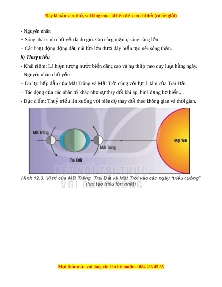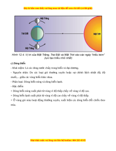 ế à do gió. Gió càng m nh, ạ sóng càng l n. ớ + Các ho t ạ đ ng ộ đ ng đ ộ t ấ , núi l a ử l n d ớ ư i ớ đáy bi n t ể o ạ nên sóng th n. ầ b) Thu t ỷ ri u ề - Khái ni m ệ : Là hi n t ệ ư ng n ợ ư c ớ bi n dâng cao ể và h t ạ h p t ấ heo quy lu t ậ h ng ằ ngày. - Nguyên nhân chủ y u ế + Do l c ự h p d ấ n c ẫ a ủ M t ặ Trăng và M t ặ Tr i ờ cùng v i ớ l c l ự i tâm c a ủ Trái Đ t ấ . + Tác đ ng c ộ a các ủ nhân tố khác nh s ư ự thay đ i ổ khí áp, hình d ng ạ b bi ờ n,... ể - Đ c ặ đi m ể : Thu t ỷ ri u l ề ên xu ng v ố i ớ biên đ t ộ hay đ i ổ theo không gian và th i ờ gian. M i ọ thắc m c