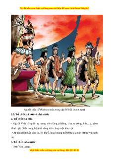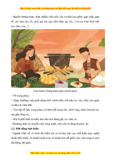 Làm bánh ch ng,bánh gi ư ày (minh h a) ọ - Về trang ph c: ụ + Ngày thư ng: ờ nam gi i ớ đóng kh , ố mình tr n; ầ n ữ m c ặ áo, váy, y m ế che ng c ự và đ u ề đi chân đ t ấ . + Vào d p l ị ễ h i ộ , trang ph c có ụ thêm đ ồ trang s c, ứ nh ư vòng, nhân, khuyên tai, mũ g n ắ lông vũ,... - Nhà ph ở ổ bi n l ế à ki u nhà s ể n l ả àm b ng ằ g , t ỗ re, n a, ứ lá. - Phư ng t ơ h c di ứ chuy n ể trên sông nư c ch ớ y ủ u l ế à dùng thuy n, bè. ề 2.2. Đ i ờ s ng t ố inh th n ầ - Ngư i ờ Vi t ệ cổ có trình độ th m