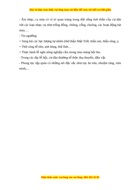 ạ ca múa có vị trí quan tr ng ọ trong đ i ờ s ng ố tinh th n ầ c a ủ cư dân v i ớ các lo i ạ nh c ạ cụ nh ư tr ng ố đ ng, ồ chiêng, c ng, ổ chuông, các ho t ạ đ ng ộ hát múa…. - Tín ngư ng: ỡ + Sùng bái các l c l ự ư ng ợ t nhi ự ên (th t ờ h n M ầ t ặ Tr i ờ , th n núi ầ , th n s ầ ông..); + Th cúng t ờ ổ tiên, anh hùng, th l ủ ĩnh… + Th c hành l ự nghi ễ nông nghi p c ệ u m ầ ong mùa màng b i ộ thu. - Trong các d p l ị h ễ i ộ , c dân t ư hư ng t ờ t ổ h c đua t ứ huy n, đ ề u v ấ t ậ . - Phong t c ụ t p ậ quán có nh ng ữ nét đ c ặ s c ắ nh ư t c ụ ăn trâu, nhu m ộ răng, xăm mình,... M i