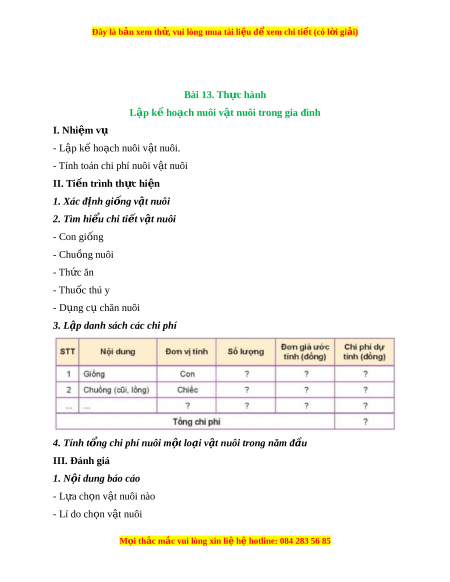 Đây là bản xem th , vu ử i lòng mua tài li u ệ đ xe ể m chi ti t (c ế ó l i ờ gi i ả ) Bài 13. Th c hành ự Lập k ho ế ch nuôi ạ v t