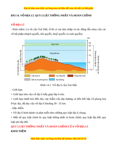 Đây là bản xem th , vu ử i lòng mua tài li u ệ đ xe ể m chi ti t ế (có l i ờ gi i ả ) BÀI 14. V Đ Ỏ A Ị LÍ. QUY LU T Ậ TH N Ố G NH T Ấ VÀ HOÀN CH N Ỉ H V Đ Ỏ A Ị LÍ - Khái ni m ệ : Là vỏ c a ủ Trái Đ t