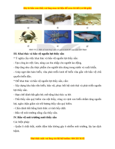 III. Khai thác và b o v ả ng ệ u n ồ l i ợ th y s ủ n ả * Ý nghĩa c a ủ vi c khai ệ thác và b o ả v ngu ệ n l ồ i ợ th y ủ s n: ả - T o công ạ ăn vi c ệ làm, nâng cao thu nh p ậ cho ngư i ờ lao đ ng. ộ - Đáp ng nhu c ứ u t ầ h c ph ự m ẩ cho ngư i ờ tiêu dùng trong nư c ớ và xu t ấ kh u. ẩ - Giúp ngư dân bám bi n, ể v a ừ phát tri n ể kinh tế bi n ể v a ừ g n ắ v i ớ b o ả vệ chủ quy n bi ề n ể đ o. ả * Để khai thác và b o ả v ngu ệ ồn l i ợ th y s ủ n, c ả n: ầ - Xây d ng ự khu b o ả t n ồ bi n, ể b o ả v , ệ ph c ụ h i ồ h ệ sinh thái và phát tri n ể ngu n ồ l i ợ th y s ủ n. ả - H n ch ạ ế đánh b t ắ g n b ầ , m ờ ở r ng khai ộ thác xa b . ờ - Thả th y ủ s n ả quý hi m ế vào n i ộ th y ủ , vũng và v nh ị ven bi n ể nh m ằ tăng ngu n ồ l i ợ , ngăn ch n gi ặ m ả sút trữ lư ng t ợ h y s ủ n quý hi ả m ế . - Cấm đánh b t ắ b ng hì ằ nh th c có t ứ ính h y di ủ t ệ . - B o ả v m ệ ôi trư ng s ờ ng ố c a t ủ h y s ủ n. ả IV. Bảo v m ệ ôi trư ng nuôi ờ th y s ủ n ả Các bi n pháp: ệ - Qu n ả lí ch t ấ th i ả , nư c ớ đ m ả b o ả không gây ô nhi m ễ môi trư ng, ờ lây lan d ch ị bệnh. M i