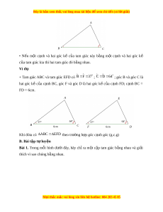 ạ BC, góc F và góc D là hai góc k ề c a ủ c nh ạ FD; c nh ạ BC = FD = 6cm. Khi đóta có A BC EF D theo trư ng h ờ p ợ góc c nh góc ạ (g.c.g) B. Bài t p t ậ l ự uy n ệ Bài 1. Trong m i ỗ hình dư i ớ đây, hãy chỉ ra m t ộ c p ặ tam giác b ng ằ nhau và gi i ả thích vì sao chúng b ng ằ nhau. M i