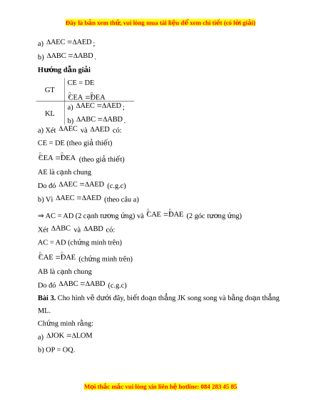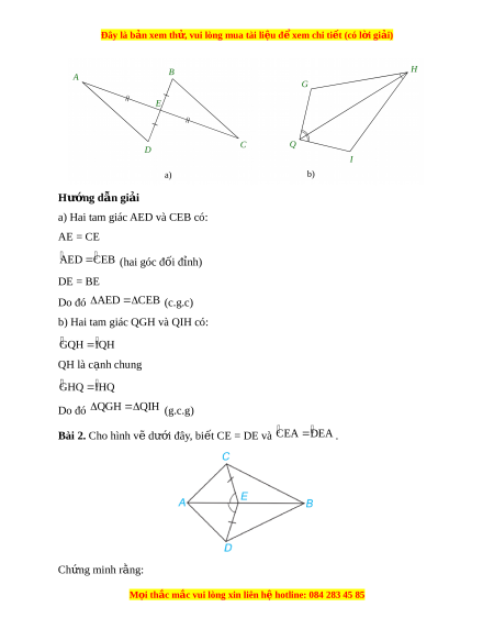 Đây là bản xem th , vu ử i lòng mua tài li u ệ đ xe ể m chi ti t (c ế ó l i ờ gi i ả ) a) A EC A ED ; b) A BC A BD . Hư ng d ớ ẫn gi i ả CE = DE GT CEA D EA a) A EC A ED ; KL b) A BC A BD . a) Xét A EC và AED có: CE = DE (theo gi t ả hi t ế ) CEA D EA (theo gi t ả hi t ế ) AE là c nh ạ chung Do đó A EC A ED (c.g.c) b) Vì A EC A ED (theo câu a) ⇒ AC = AD (2 c nh t ạ ư ng ơ ng) ứ và CAE DA E (2 góc tư ng ơ ng) ứ Xét A BC và ABD có: AC = AD (ch ng m ứ inh trên) CAE D AE (ch ng m ứ inh trên) AB là c nh ạ chung Do đó A BC A BD (c.g.c)