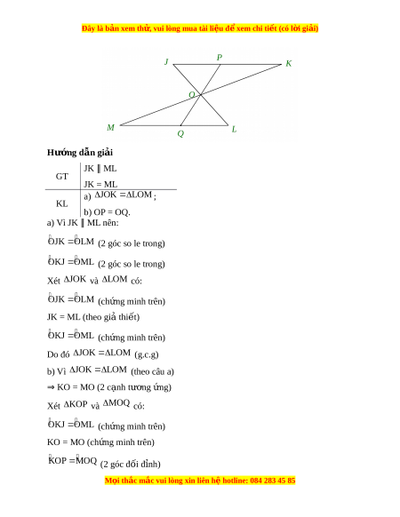 Bài 3. Cho hình vẽ dư i ớ đây, bi t ế đo n ạ th ng J ẳ K song song và b ng ằ đo n t ạ h ng ẳ ML. Ch ng ứ minh r ng: ằ a) JO K L OM b) OP = OQ. M i