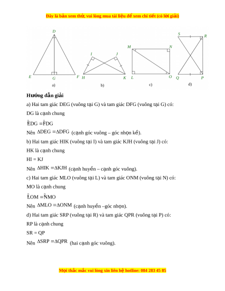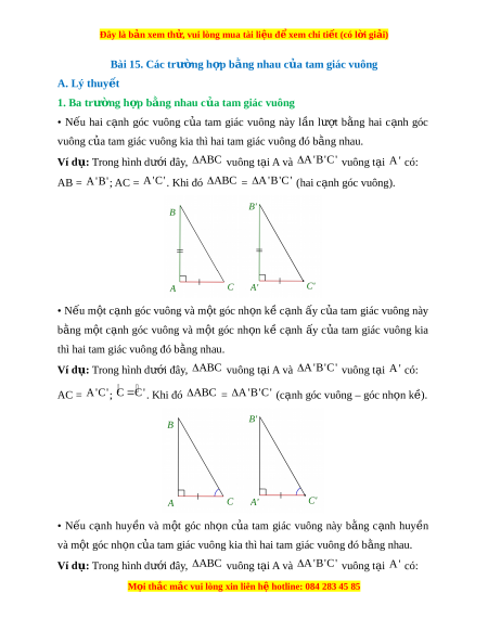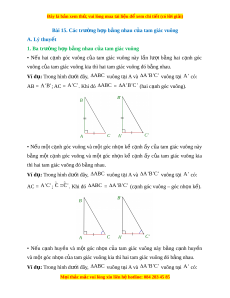 Đây là bản xem th , vu ử i lòng mua tài li u ệ đ xe ể m chi ti t (c ế ó l i ờ gi i ả ) Bài 15. Các trư ng h ờ p b ợ ng n ằ hau c a t ủ am giác vuông A. Lý thuy t ế 1. Ba trư ng h ờ p ợ b ng nha ằ u c a t ủ am giác vuông • N u ế hai c nh ạ góc vuông c a ủ tam giác vuông này l n ầ lư t ợ b ng ằ hai c nh ạ góc vuông c a