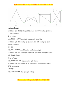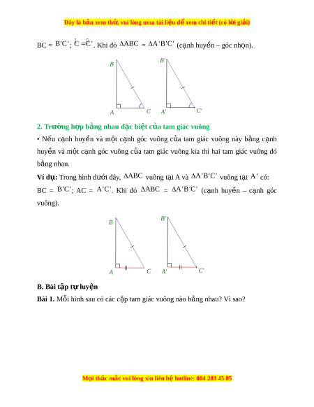 Đây là bản xem th , vu ử i lòng mua tài li u ệ đ xe ể m chi ti t (c ế ó l i ờ gi i ả ) BC = B'C'; C C ' . Khi đó A BC = A 'B'C' (c nh huy ạ n – góc nh ề n) ọ . 2. Trư ng h ờ p b ợ ng nhau đ ằ c b ặ i t ệ c a t ủ am giác vuông • N u ế c nh ạ huy n ề và m t ộ c nh ạ góc vuông c a ủ tam giác vuông này b ng ằ c nh ạ huy n ề và m t ộ c nh ạ góc vuông c a