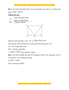 Bài 2. Cho hình chữ nh t ậ ABCD, M là trung đi m ể c a ủ c nh ạ CD. Ch ng ứ minh r ng ằ A DM B CM . Hư ng d ớ ẫn gi i ả Hình ch nh ữ t ậ ABCD GT DM = CM (M ∈ DC) KL A DM B CM ABCD là hình chữ nh t ậ ⇒ AD = BC và ADM B CM 9 0 Xét tam giác ADM (vuông t i