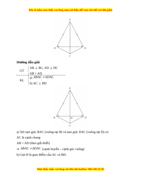 Bài 3. Cho hình vẽ dư i ớ đây, bi t ế AB vuông góc v i ớ BC, AD vuông góc v i ớ CD và c nh ạ AB = AD. Ch ng ứ minh r ng: ằ a) B AC D AC ; b) AC vuông góc v i ớ BD. M i