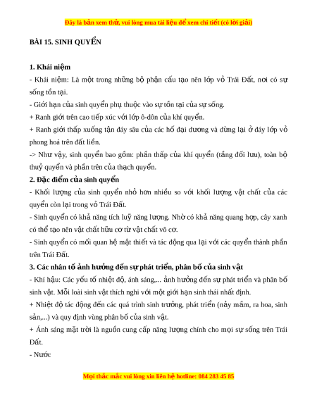 Đây là bản xem th , vu ử i lòng mua tài li u ệ đ xe ể m chi ti t ế (có l i ờ gi i ả ) BÀI 15. SINH QUY N Ể 1. Khái ni m ệ - Khái ni m ệ : Là m t ộ trong nh ng ữ bộ ph n ậ c u ấ t o ạ nên l p ớ vỏ Trái Đ t ấ , n i ơ có sự sống tồn t i ạ . - Gi i ớ h n ạ c a s ủ inh quy n ể ph t ụ hu c vào s ộ ự t n t ồ i ạ c a s ủ ự s ng. ố + Ranh gi i ớ trên cao ti p xúc v ế i ớ l p ô- ớ dôn c a khí ủ quy n. ể + Ranh gi i ớ th p ấ xu ng ố t n ậ đáy sâu c a ủ các hố đ i ạ dư ng ơ và d ng ừ l i ạ ở đáy l p ớ vỏ phong hoá trên đ t ấ li n. ề -> Như v y ậ , sinh quy n ể bao g m ồ : ph n ầ th p ấ c a ủ khí quy n ể (t ng ầ đ i ố l u ư ), toàn bộ thu quy ỷ n và ể ph n t ầ rên c a ủ th ch ạ quy n. ể 2. Đặc đi m ể c a s ủ inh quy n ể - Kh i ố lư ng ợ c a ủ sinh quy n ể nhỏ h n ơ nhi u ề so v i ớ kh i ố lư ng ợ v t ậ ch t ấ c a ủ các quy n còn ể l i ạ trong vỏ Trái Đ t ấ . - Sinh quy n ể có kh ả năng tích lu ỹ năng lư ng. ợ Nh ờ có kh ả năng quang h p, ợ cây xanh có thể t o nên v ạ t ậ ch t ấ h u ữ c t ơ v ừ t ậ ch t ấ vô c . ơ - Sinh quy n ể có m i ố quan h ệ m t ậ thi t ế và tác đ ng ộ qua l i ạ v i ớ các quy n ể thành ph n ầ trên Trái Đ t ấ . 3. Các nhân t ố n ả h hư ng đ ở n s ế phát ự tri n, phân b ể c ố a s ủ inh v t ậ - Khí h u: ậ Các y u ế tố nhi t ệ đ , ộ ánh sáng,... nh ả hư ng ở đ n ế sự phát tri n ể và phân bố sinh v t ậ . Mỗi loài sinh v t ậ thích nghi v i ớ m t ộ gi i ớ h n ạ sinh thái nh t ấ đ nh. ị + Nhi t ệ độ tác đ ng ộ đ n