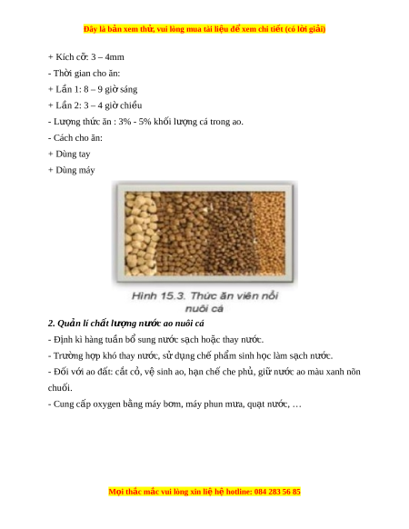 Đây là bản xem th , vu ử i lòng mua tài li u ệ đ xe ể m chi ti t (c ế ó l i ờ gi i ả ) + Kích c : ỡ 3 – 4mm - Th i ờ gian cho ăn: + L n 1: ầ 8 – 9 giờ sáng + L n 2: ầ 3 – 4 giờ chi u ề - Lư ng t ợ h c ăn : ứ 3% - 5% kh i ố lư ng ợ cá trong ao. - Cách cho ăn: + Dùng tay + Dùng máy