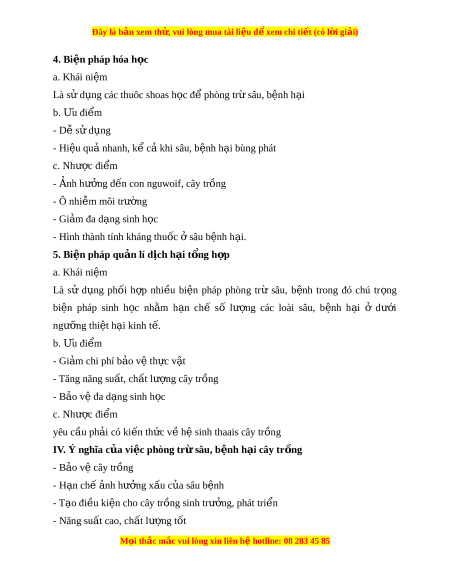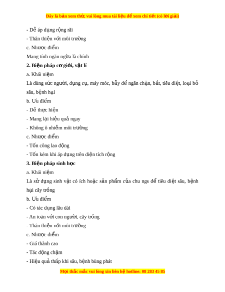 Đây là bản xem th , vu ử i lòng mua tài li u ệ đ xe ể m chi ti t (c ế ó l i ờ gi i ả ) - D áp d ễ ng r ụ ng r ộ ãi - Thân thi n v ệ i ớ môi trư ng ờ c. Nhược đi m ể Mang tính ngăn ng a l ừ à chính 2. Bi n ệ pháp cơ gi i ớ , v t ậ lí a. Khái ni m ệ Là dùng s c ứ ngư i ờ , d ng ụ c , ụ máy móc, b y ẫ đ ể ngăn ch n, ặ b t ắ , tiêu di t ệ , lo i ạ bỏ sâu, bệnh h i ạ b. u đi Ư m ể - D t ễ h c hi ự n ệ - Mang l i ạ hi u qu ệ ngay ả - Không ô nhi m ễ môi trư ng ờ c. Nhược đi m ể - Tốn công lao đ ng ộ - Tốn kém khi áp d ng t ụ rên di n t ệ ích r ng ộ 3. Bi n ệ pháp sinh h c ọ a. Khái ni m ệ Là sử d ng ụ sinh v t ậ có ích ho c ặ s n ả ph m ẩ c a ủ chu ngs để tiêu di t ệ sâu, b nh ệ h i ạ cây trồng b. u đi Ư m ể - Có tác d ng l ụ âu dài - An toàn v i ớ con ngư i ờ , cây tr ng ồ - Thân thi n v ệ i ớ môi trư ng ờ c. Nhược đi m ể - Giá thành cao - Tác đ ng ch ộ m ậ - Hi u qu ệ t ả h p khi ấ sâu, b nh bùng phát ệ M i