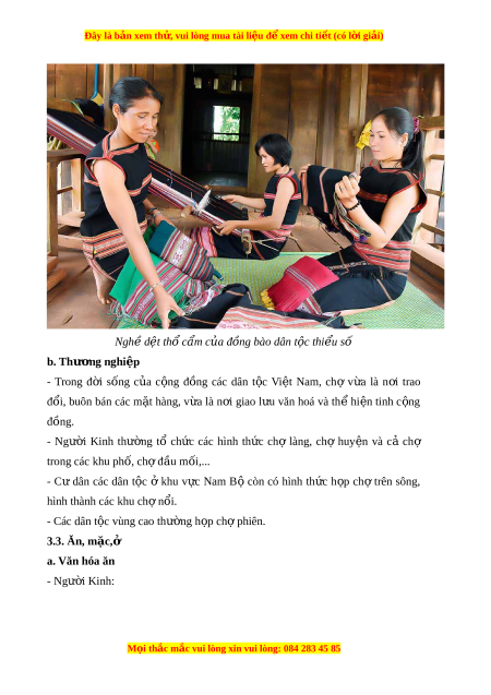 Đây là bản xem th , vu ử i lòng mua tài li u ệ đ xe ể m chi ti t (c ế ó l i ờ gi i ả ) Nghề dệt thổ c m ẩ c a ủ đ ng bào dân t ồ c ộ thi u ể số b. Thư ng ngh ơ i p ệ - Trong đ i ờ s ng ố c a ủ c ng ộ đ ng ồ các dân t c ộ Vi t ệ Nam, chợ v a ừ là n i ơ trao đổi, buôn bán các m t ặ hàng, v a ừ là n i ơ giao l u ư văn hoá và th ể hi n ệ tinh c ng ộ đồng. - Ngư i ờ Kinh thư ng ờ tổ ch c ứ các hình th c ứ chợ làng, chợ huy n ệ và cả chợ trong các khu phố, ch đ ợ ầu mối,... - Cư dân các dân t c ộ ở khu v c