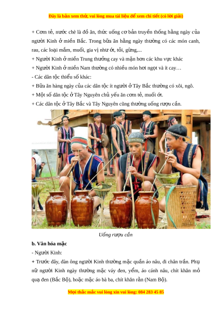 ự Nam Bộ còn có hình th c ứ h p ọ ch ợ trên sông, hình thành các khu ch n ợ ổi. - Các dân t c vùng cao t ộ hư ng ờ h p ch ọ phi ợ ên. 3.3. Ăn, mặc,ở a. Văn hóa ăn - Ngư i ờ Kinh: M i ọ thắc m c