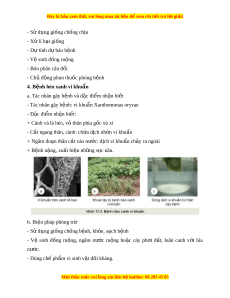 a. Tác nhân gây bệnh và đ c ặ đi m ể nh n bi ậ t ế - Tác nhân gây b nh: ệ vi khu n X ẩ anthomonas oryzae - Đ c ặ đi m ể nh n bi ậ t ế : + Cành và lá héo, v t ỏ hân phía g c xù xì ố - C t ắ ngang thân, cành: ch a ứ d ch ị nh n vi ờ khu n ẩ + Ngâm đo n ạ thân c t ắ vào nư c: ớ d ch vi ị khu n ch ẩ y r ả a ngoài + B nh n ệ ng, ặ xu t ấ hi n nh ệ ng ữ s c nâu. ọ b. Biện pháp phòng trừ - S d ử ng gi ụ ống chống bệnh, kh e, ỏ s ch ạ b nh ệ - Vệ sinh đ ng ồ ru ng, ộ ngâm nư c ớ ru ng ộ ho c ặ cày ph i ơ đ t ấ , luân canh v i ớ lúa nư c. ớ - Dùng ch ph ế ẩm vi sinh v t ậ đ i ố kháng. M i