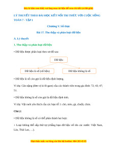 Ọ KẾT NỐI TRI TH C Ứ V I Ớ CU C Ộ S N Ố G TOÁN 7 - TẬP 1 Chư ng ơ V. S t ố h c ự Bài 17. Thu th p và p ậ hân lo i ạ d l ữ i u ệ A. Lý thuy t ế 1. Thu th p và phâ ậ n lo i ạ d l ữ i u ệ • Dữ li u đ ệ ư c ợ phân lo i ạ theo s đ ơ s ồ au: Dữ li u ệ Dữ li u l ệ à s ( ố s l ố i u) ệ Dữ li u không l ệ à số • Dữ li u l ệ à số còn g i ọ là d l ữ i u đ ệ nh l ị ư ng. ợ Ví d : ụ Cân n ng ặ (đ n ơ v ki ị -lô-gam) c a