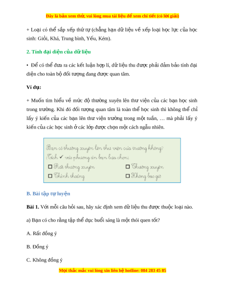 ọ sinh thì không thể chỉ lấy ý ki n ế c a ủ các b n ạ lên thư vi n ệ trư ng ờ trong m t ộ tu n, ầ … mà ph i ả l y ấ ý ki n c ế a ủ các h c ọ sinh các ở l p đ ớ ư c ợ ch n m ọ t ộ cách ng u nhi ẫ ên. B. Bài t p t ậ l ự uy n ệ Bài 1. V i ớ mỗi câu h i ỏ sau, hãy xác đ nh xem ị d l ữ i u t ệ hu đư c t ợ hu c ộ lo i ạ nào. a) B n ạ có cho r ng t ằ p ậ th d ể c bu ụ i ổ sáng là m t ộ thói quen t t ố ? A. Rất đồng ý B. Đồng ý C. Không đồng ý M i