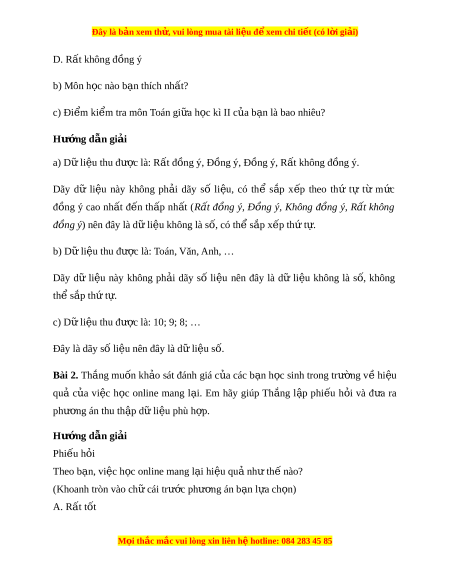Đây là bản xem th , vu ử i lòng mua tài li u ệ đ xe ể m chi ti t (c ế ó l i ờ gi i ả ) D. Rất không đồng ý b) Môn h c ọ nào b n t ạ hích nh t ấ ? c) Đi m ể ki m ể tra môn Toán gi a h ữ c ọ kì II c a b ủ n ạ là bao nhiêu? Hư ng d ớ ẫn gi i ả a) D l ữ i u t ệ hu đư c l ợ à: R t ấ đ ng ý, Đ ồ ng ý, Đ ồ ng ý, R ồ t ấ không đ ng ý. ồ Dãy dữ li u ệ này không ph i ả dãy số li u, ệ có thể s p ắ x p ế theo thứ tự từ m c ứ đồng ý cao nh t ấ đ n ế th p ấ nh t ấ (Rất đ ng ồ ý, Đ ng ồ ý, Không đ ng ồ ý, R t ấ không