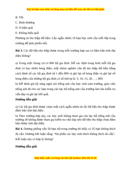 Đây là bản xem th , vu ử i lòng mua tài li u ệ đ xe ể m chi ti t (c ế ó l i ờ gi i ả ) B. T t ố C. Bình thư ng ờ D. Ít hi u qu ệ ả E. Không hi u qu ệ ả Phư ng ơ án thu th p ậ d ữ li u: ệ L y ấ ng u ẫ nhiên 10 b n ạ h c ọ sinh c a ủ m i ỗ l p ớ trong trư ng đ ờ phát ể phi u ế h i ỏ . Bài 3. Các dữ li u ệ thu th p ậ đư c ợ trong m i ỗ trư ng ờ h p ợ sau có đ m ả b o ả tính đ i ạ diện không? a) Trong m t