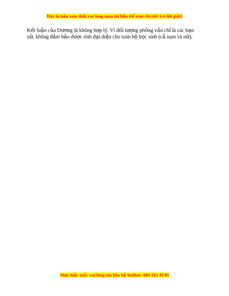 ọ sinh không tham gia câu l c ạ bộ ti ng ế anh c a ủ trư ng ờ s ẽ không đư c ợ tham gia ki m ể tra v n đáp ấ nên d l ữ i u t ệ hu th p ậ ch a ư đ m ả b o ả đư c t ợ ính đ i ạ di n. ệ Bài 4. Dư ng ơ ph ng ỏ v n ấ 50 b n ạ n ữ trong trư ng ờ thì th y ấ có 35 b n ạ không thích đá c u. ầ Dư ng ơ k t ế lu n ậ r ng: ằ “Đa ph n ầ các h c