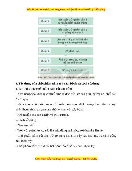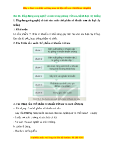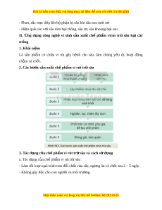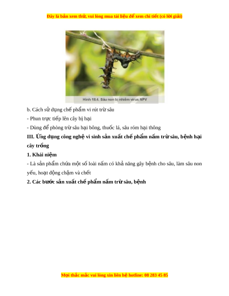 Đây là bản xem th , vu ử i lòng mua tài li u ệ đ xe ể m chi ti t (c ế ó l i ờ gi i ả ) b. Cách sử d ng ch ụ ph ế ẩm vi rút tr s ừ âu - Phun tr c ự ti p ế lên cây b h ị i ạ - Dùng đ phòng t ể r s ừ âu h i ạ bông, thu c ố lá, sâu róm h i ạ thông III. ng Ứ d ng ụ công ngh ệ vi sinh s n ả xu t ấ ch ế ph m ẩ n m ấ tr ừ sâu, b nh ệ h i ạ cây tr ng ồ 1. Khái ni m ệ - Là s n ả ph m ẩ ch a ứ m t ộ s ố loài n m ấ có kh ả năng gây b nh ệ cho sâu, làm sâu non y u, ho ế t ạ đ ng ch ộ m ậ và ch t ế 2. Các bư c ớ sản xu t ấ ch ph ế m ẩ n m ấ tr s ừ âu, b nh ệ M i