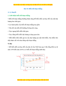 Đây là bản xem th , vu ử i lòng mua tài li u ệ đ xe ể m chi ti t (c ế ó l i ờ gi i ả ) Bài 19. Bi u đ ể đo ồ n t ạ h ng ẳ A. Lý thuy t ế 1. Gi i ớ thi u b ệ i u đ ể đ ồ o n t ạ h ng ẳ • Bi u ể đồ đo n ạ th ng ẳ thư ng ờ đư c ợ dùng đ ể bi u ể di n ễ s ự thay đ i ổ c a ủ m t ộ đ i ạ lư ng ợ theo th i ờ gian. • Các thành ph n c ầ a bi ủ u đ ể ồ đo n ạ th ng bao g ẳ m ồ : + Tiêu đề c a bi ủ u đ ể ồ thư ng ờ dòng t ở rên cùng. + Tr c ngang bi ụ u di ể n ễ th i ờ gian. + Tr c đ ụ ng bi ứ u di ể n ễ đ i ạ lư ng t ợ a đang quan tâm. + Mỗi đi m ể bi u ể di n ễ giá trị c a ủ đ i ạ lư ng ợ t i ạ m t ộ th i ờ đi m ể . Hai đi m ể liên ti p đ ế ư c ợ n i ố v i ớ nhau b ng m ằ t ộ đo n ạ th ng. ẳ Ví d : ụ + Để bi u ể di n ễ s ự thay đ i ổ c a ủ dân s ố c a ủ Vi t ệ Nam qua 5 l n ầ t ng ổ đi u ề tra từ năm 1979 đ n ế năm 2019 ta có bi u đ ể đo ồ n t ạ h ng ẳ dư i ớ đây: M i