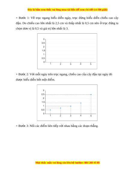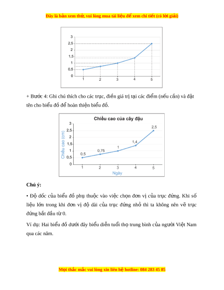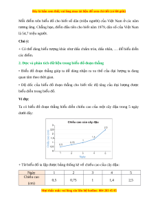 Đây là bản xem th , vu ử i lòng mua tài li u ệ đ xe ể m chi ti t (c ế ó l i ờ gi i ả ) Mỗi đi m ể trên bi u ể đồ cho bi t ế số dân (tri u ệ ngư i ờ ) c a ủ Vi t ệ Nam ở các năm tư ng ơ ng. ứ Ch ng ẳ h n, ạ đi m ể đ u ầ tiên cho bi t ế năm 1979, dân s ố c a ủ Vi t ệ Nam là 54,7 tri u ng ệ ư i ờ . Chú ý: + Có thể dùng bi u ể tư ng ợ khác như d u ấ ch m ấ tròn, d u ấ nhân, … đ ể bi u ể di n ễ các đi m ể . 2. Đ c ọ và phân tích d l ữ i u t ệ rong bi u đ ể đo ồ n t ạ h ng ẳ • Bi u ể đồ đo n ạ th ng ẳ giúp ta dễ dàng nh n ậ ra xu thế c a ủ đ i ạ lư ng ợ ta đang quan tâm theo th i ờ gian. • Độ d c ố c a ủ bi u ể đồ đo n ạ th ng ẳ cho bi t ế t c ố độ tăng c a ủ đ i ạ lư ng ợ đư c ợ bi u di ể n t ễ rong bi u đ ể ồ. Ví d : ụ Ta có bi u ể đồ đo n ạ th ng ẳ bi u ể di n ễ chi u ề cao c a ủ m t ộ cây đ u ậ trong 5 ngày dư i ớ đây: + T bi ừ u đ ể ồ ta l p ậ đư c b ợ ng ả th ng kê v ố ề chi u cao c ề a ủ cây đ u: ậ Ngày 1 2 3 4 5 Chi u cao ề 0,5 0,75 1 1,4 2,5 (cm) M i