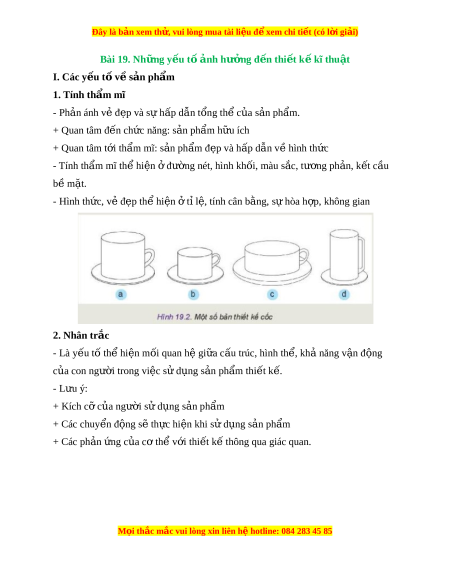 Đây là bản xem th , vu ử i lòng mua tài li u ệ đ xe ể m chi ti t (c ế ó l i ờ gi i ả ) Bài 19. Nh ng y ữ u t ế ố n ả h hư ng đ ở n t ế hi t ế k kĩ ế thu t ậ I. Các y u t ế v ố s ề ản ph m ẩ 1. Tính th m ẩ mĩ - Ph n ánh v ả đ ẻ p và s ẹ ự hấp dẫn tổng th c ể a ủ s n ả ph m ẩ . + Quan tâm đ n ế ch c năng: ứ s n ph ả m ẩ h u í ữ ch + Quan tâm t i ớ th m ẩ mĩ: s n ả ph m ẩ đ p và ẹ h p d ấ n v ẫ hì ề nh th c ứ - Tính th m ẩ mĩ th hi ể n ệ đ ở ư ng ờ nét, hình kh i ố , màu s c, ắ tư ng ph ơ n, k ả t ế c u ầ b m ề t ặ . - Hình th c, v ứ đ ẻ p t ẹ h hi ể n ệ t ở l ỉ , t ệ ính cân b ng, ằ s hòa h ự p, không gi ợ an 2. Nhân tr c ắ - Là y u t ế ố th hi ể n m ệ i ố quan h gi ệ a c ữ u t ấ rúc, hình th , kh ể năng v ả n ậ đ ng ộ c a ủ con ngư i ờ trong vi c s ệ d ử ng ụ s n ả ph m ẩ thi t ế k . ế - L u ý ư : + Kích cỡ c a ng ủ ư i ờ s d ử ng s ụ n ph ả m ẩ + Các chuy n đ ể ng ộ s t ẽ h c hi ự n khi ệ s d ử ng ụ s n ả ph m ẩ + Các ph n ả ng ứ c a c ủ ơ thể v i ớ thi t ế k t ế hông qua giác quan. M i