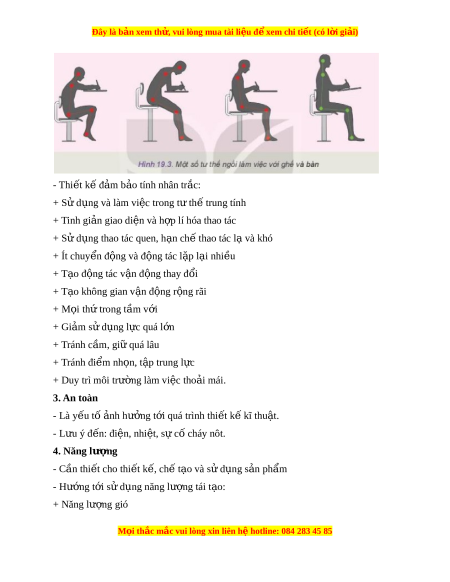 Đây là bản xem th , vu ử i lòng mua tài li u ệ đ xe ể m chi ti t (c ế ó l i ờ gi i ả ) - Thi t ế k đ ế m ả b o ả tính nhân tr c: ắ + S d ử ng và ụ làm vi c t ệ rong t t ư h t ế rung tính + Tinh gi n ả giao di n và ệ h p l ợ í hóa thao tác + S d ử ng t ụ hao tác quen, h n ch ạ ế thao tác l và ạ khó + Ít chuy n đ ể ng và đ ộ ng ộ tác l p l ặ i ạ nhi u ề + T o đ ạ ng t ộ ác v n ậ đ ng t ộ hay đ i ổ + T o không gi ạ an v n đ ậ ng ộ r ng r ộ ãi + M i ọ th t ứ rong t m ầ v i ớ + Gi m ả s d ử ng l ụ c ự quá l n ớ + Tránh c m ầ , gi quá l ữ âu + Tránh đi m ể nh n, t ọ p ậ trung l c ự + Duy trì môi trư ng l ờ àm vi c t ệ ho i ả mái. 3. An toàn - Là y u t ế ố nh ả hư ng t ở i ớ quá trình thi t ế k kĩ ế thu t ậ . - L u ý đ ư n: ế đi n, nhi ệ t ệ , sự c cháy nôt ố . 4. Năng lư ng ợ - Cần thi t ế cho thi t ế k , ch ế ế t o và s ạ ử d ng s ụ n ả ph m ẩ - Hư ng t ớ i ớ s d ử ng năng l ụ ư ng ợ tái t o: ạ + Năng lư ng ợ gió M i