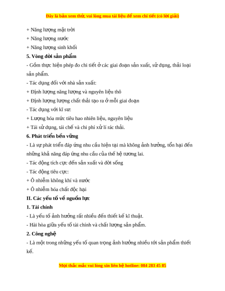 ứ tiêu hao nhiên li u, nguyên ệ li u ệ + Tái sử d ng, t ụ ái ch và ế chi phí x l ử í rác th i ả . 6. Phát tri n b ể n v ề ng ữ - Là s phát ự tri n đáp ể ng nhu c ứ u hi ầ n t ệ i ạ mà không nh ả hư ng, t ở n h ổ i ạ đ n ế nh ng kh ữ ả năng đáp ng nhu c ứ ầu c a ủ th h ế ệ tư ng l ơ ai. - Tác đ ng t ộ ích c c ự đ n s ế n xu ả t ấ và đ i ờ s ng ố - Tác đ ng t ộ iêu c c: ự + Ô nhi m ễ không khí và nư c ớ + Ô nhi m ễ hóa ch t ấ đ c ộ h i ạ II. Các y u t ế v ố ề ngu n l ồ c ự 1. Tài chính - Là y u t ế ố nh ả hư ng r ở t ấ nhi u ề đ n t ế hi t ế k kĩ ế thu t ậ . - Hài hòa gi a y ữ u ế t t ố ài chính và ch t ấ lư ng ợ s n ả ph m ẩ . 2. Công nghệ - Là m t ộ trong nh ng y ữ u t ế quan t ố r ng ọ nh h ả ư ng ở nhi u t ề i ớ s n ph ả m ẩ thi t ế k . ế M i