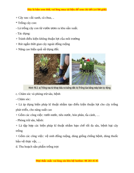 Đây là bản xem th , vu ử i lòng mua tài li u ệ đ xe ể m chi ti t (c ế ó l i ờ gi i ả ) + Cây rau: c i ả xanh, cà chua, .. * Trồng cây con: - Là trồng cây con t v ừ ư n ờ ư m ơ ra khu s n ả xu t ấ . - Tác d ng: ụ + Tránh đi u ki ề n không t ệ hu n l ậ i ợ c a ủ môi trư ng ờ + Rút ng n t ắ h i ờ gian cây ngoài đ ng r ồ u ng ộ + Nâng cao hi u qu ệ s ả ử d ng đ ụ t ấ . c. Chăm sóc và phòng tr s ừ âu, b nh ệ - Chăm sóc: + Là áp d ng ụ bi n ệ pháp kĩ thu t ậ nh m ằ t o ạ đi u ề ki n ệ thu n ậ l i ợ cho cây tr ng ồ phát tri n, cho năng s ể u t ấ cao + Gồm các công vi c: ệ tư i ớ nư c, t ớ iêu nư c, ớ bón phân, t a cành, … ỉ - Phòng tr s ừ âu, b nh: ệ + Là t p ậ h p ợ các bi n ệ pháp kĩ thu t ậ nh m ằ h n ạ chế t i ố đa sâu, b nh ệ h i ạ cây trồng + Gồm các công vi c: ệ vệ sinh đ ng ồ ru ng, ộ dùng gi ng ố ch ng ố b nh, ệ dùng thu c ố b o ả v t ệ h c v ự t ậ , … d. Thu ho ch ạ s n ả ph m ẩ tr ng t ồ r t ọ M i