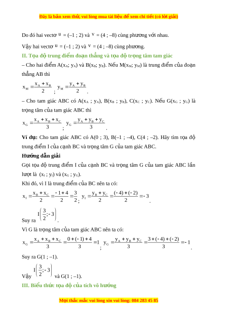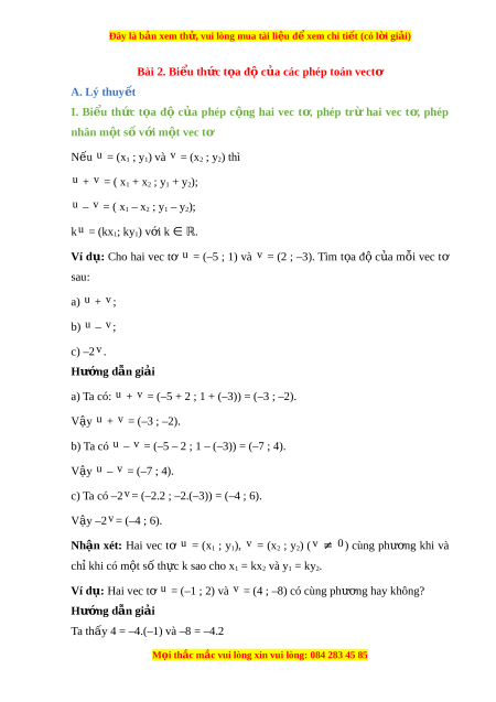 Đây là bản xem th , vu ử i lòng mua tài li u ệ đ xe ể m chi ti t ế (có l i ờ gi i ả ) Bài 2. Bi u t ể h c t ứ a đ ọ c ộ a các ủ phép toán vectơ A. Lý thuy t ế I. Bi u ể th c ứ t a ọ độ c a ủ phép c ng ộ hai vec t ,