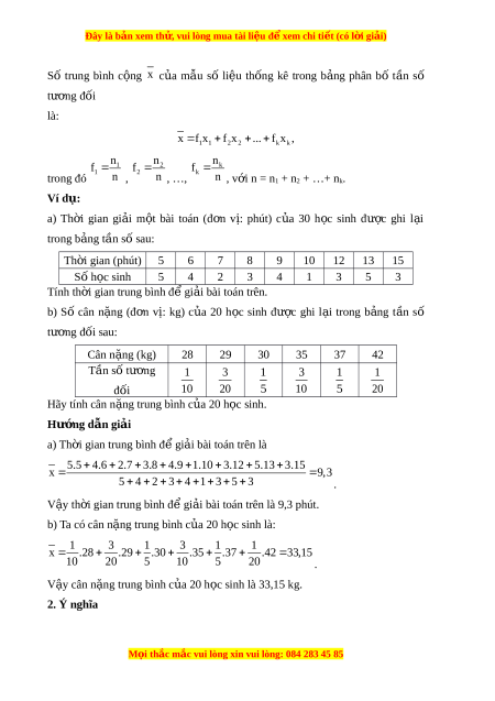 x f x ... f x , 1 1 2 2 k k n n n 1 f 2 f k f trong đó 1 n , 2 n , …, k n , v i ớ n = n1 + n2 + …+ nk. Ví d : ụ a) Th i ờ gian gi i ả m t ộ bài toán (đ n ơ v :ị phút) c a ủ 30 h c ọ sinh đư c ợ ghi l i ạ trong b ng t ả ần số sau: Th i ờ gian (phút) 5 6 7 8 9 10 12 13 15 Số h c s ọ inh 5 4 2 3 4 1 3 5 3 Tính th i ờ gian trung bình đ gi ể i ả bài toán trên. b) Số cân n ng ặ (đ n ơ v : ị kg) c a ủ 20 h c ọ sinh đư c ợ ghi l i ạ trong b ng ả t n ầ số tư ng ơ đối sau: Cân n ng ( ặ kg) 28 29 30 35 37 42 Tần số tư ng ơ 1 3 1 3 1 1 đối 10 20 5 10 5 20 Hãy tính cân n ng t ặ rung bình c a 20 h ủ c ọ sinh. Hư ng d ớ ẫn gi i ả a) Th i ờ gian trung bình đ gi ể i ả bài toán trên là