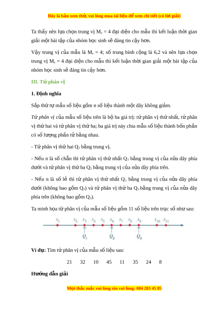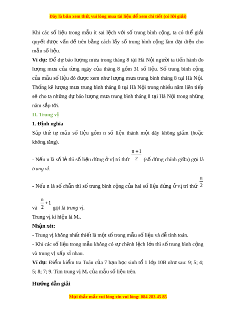 ụ Để dự báo lư ng ợ m a ư trong tháng 8 t i ạ Hà N i ộ ngư i ờ ta ti n ế hành đo lư ng ợ m a ư c a ủ t ng ừ ngày c a ủ tháng 8 g m ồ 31 số li u. ệ Số trung bình c ng ộ c a ủ m u ẫ số li u ệ đó đư c ợ xem như lư ng ợ m a ư trung bình tháng 8 t i ạ Hà N i ộ . Thống kê lư ng ợ m a ư trung bình tháng 8 t i ạ Hà N i ộ trong nhi u ề năm liên ti p ế sẽ cho ta nh ng ữ d ự báo lư ng ợ m a ư trung bình tháng 8 t i ạ Hà N i ộ trong nh ng ữ năm s p ắ t i ớ . II. Trung vị 1. Đ nh ng ị hĩa S p ắ thứ tự m u ẫ số li u ệ g m ồ n số li u ệ thành m t ộ dãy không gi m ả (ho c ặ không tăng). n 1 - N u ế n là s ố l ẻ thì s ố li u ệ đ ng ứ ở v ịtrí th ứ 2 (số đ ng ứ chính gi a) ữ g i ọ là trung vị. n - N u ế n là số ch n ẵ thì số trung bình c ng ộ c a ủ hai s ố li u ệ đ ng ứ ở v ịtrí th ứ 2 n 1 và 2 g i ọ là trung vị. Trung v kí ị hi u l ệ à Me. Nhận xét: - Trung vị không nh t ấ thi t ế là m t ộ s t ố rong m u s ẫ l ố i u và d ệ t ễ ính toán. - Khi các số li u ệ trong m u ẫ không có s ự chênh l ch ệ l n ớ thì s ố trung bình c ng ộ và trung v x ị p x ấ nhau. ỉ Ví dụ: Đi m ể ki m ể tra Toán c a ủ 7 b n ạ h c ọ sinh t ổ 1 l p ớ 10B nh ư sau: 9; 5; 4; 5; 8; 7; 9. Tìm trung v M ị e c a ủ mẫu số liệu trên. Hư ng ớ d n gi ẫ i ả M i