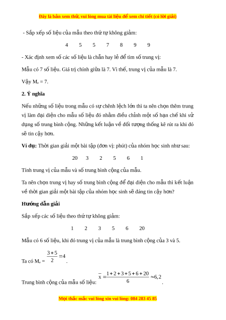 Đây là bản xem th , vu ử i lòng mua tài li u ệ đ xe ể m chi ti t ế (có l i ờ gi i ả ) Khi các số li u ệ trong m u ẫ ít sai l ch ệ v i ớ số trung bình c ng, ộ ta có thể gi i ả quy t ế đư c ợ v n ấ đề trên b ng ằ cách l y ấ số trung bình c ng ộ làm đ i ạ di n ệ cho mẫu số liệu. Ví d :