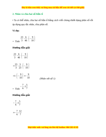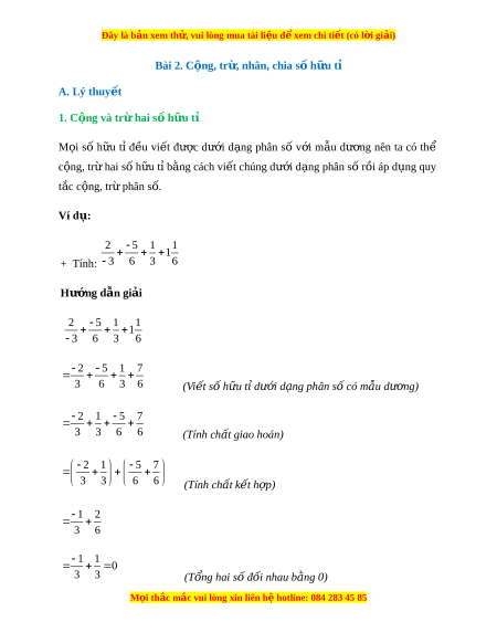 Đây là bản xem th , vu ử i lòng mua tài li u ệ đ xe ể m chi ti t (c ế ó l i ờ gi i ả ) Bài 2. C ng, t ộ r , nhân, chi ừ a số hữu tỉ A. Lý thuy t ế 1. C ng ộ và tr hai ừ số h u t ữ ỉ M i ọ số h u ữ tỉ đ u ề vi t ế đư c ợ dư i ớ d ng ạ phân số v i ớ m u ẫ dư ng ơ nên ta có thể c ng, ộ tr hai ừ số h u t ữ b ỉ ng ằ cách vi t ế chúng dư i ớ d ng ạ phân s ố r i ồ áp d ng ụ quy t c ắ c ng, t ộ r phân s ừ ố. Ví d : ụ 2 5 1 1 1 + Tính: 3 6 3 6 Hư ng d ớ ẫn gi i ả 2 5 1 1 1 3 6 3 6 2 5 1 7 3 6 3 6 (Vi t ế số h u t ữ ỉ dư i ớ d ng