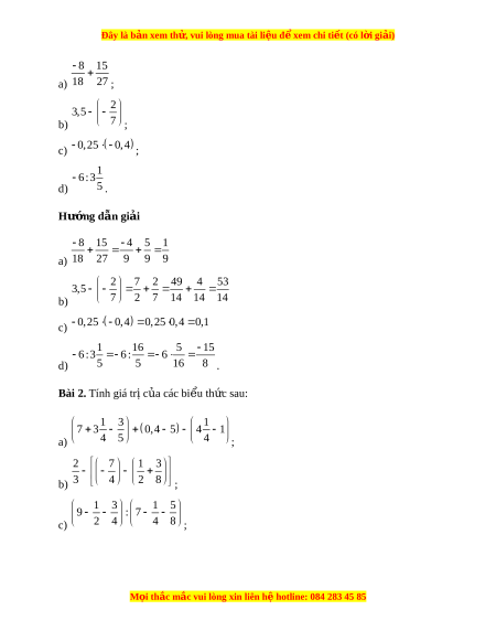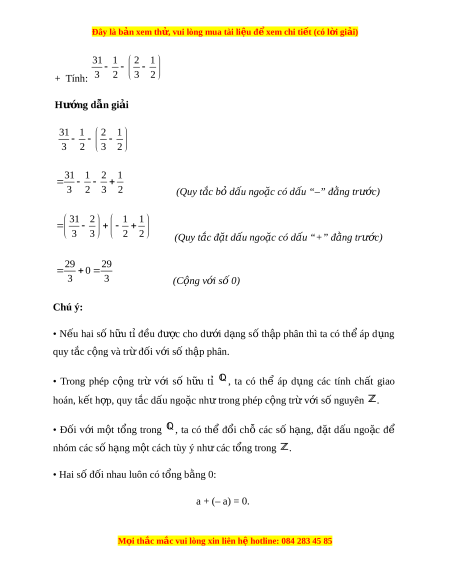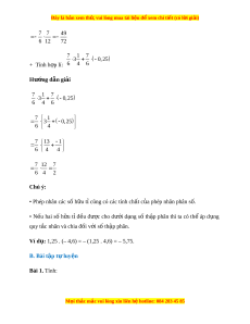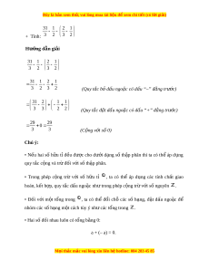 Đây là bản xem th , vu ử i lòng mua tài li u ệ đ xe ể m chi ti t (c ế ó l i ờ gi i ả ) 31 1 2 1 + Tính: 3 2 3 2 Hư ng d ớ ẫn gi i ả 31 1 2 1 3 2 3 2 31 1 2 1 3 2 3 2 (Quy t c b ắ d ỏ u ngo ấ c ặ có d u “ ấ –” đ ng t ằ rước) 31 2 1 1 3 3 2 2 (Quy t c đ ắ t ặ d u ngo ấ ặc có d u “+ ấ ” đ ng ằ trư c) ớ 29 29 0 3 3 (C ng v ộ i ớ số 0) Chú ý: • N u ế hai số h u ữ t ỉđ u ề đư c ợ cho dư i ớ d ng ạ s ố th p ậ phân thì ta có th ể áp d ng ụ quy t c ắ c ng và t ộ r đ ừ ối v i ớ s t ố h p phân. ậ • Trong phép c ng ộ trừ v i ớ số h u