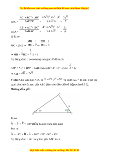 Đây là bản xem th , vu ử i lòng mua tài li u ệ đ xe ể m chi ti t (c ế ó l i ờ gi i ả ) 2 2 2 AC 2 2 2 BC AB (2 7) 6 4 2 7 cosC = 2AC.BC = 2.2 7.6 = 7 2 2 2 AB 2 2 2 AC BC 4 (2 7) 6 7 cosA = 2AB.AC = 2.4.2 7 = 14 b) Ta có: MB 1 MB 1 MC = 2MB ⇒ MC = 2 ⇒ BC = 3 1 1 ⇒ MB = 3 BC = 3 .6 = 2 Áp d ng ụ đ nh l ị