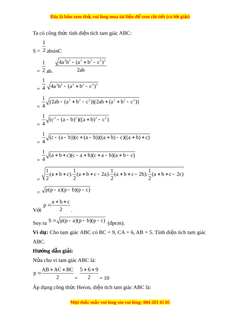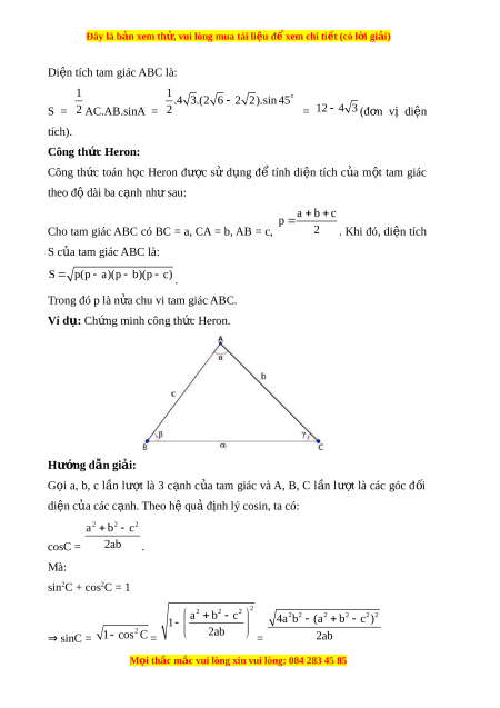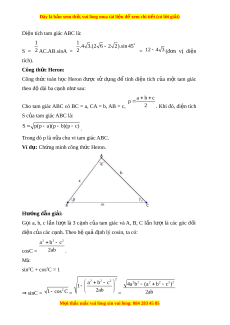 Diện tích tam giác ABC là: 1 1 .4 3.(2 6 2 2).sin45 S = 2 AC.AB.sinA = 2 = 12 4 3 (đ n ơ vị di n ệ tích). Công th c ứ Heron: Công th c ứ toán h c ọ Heron đư c ợ sử d ng ụ để tính di n ệ tích c a ủ m t ộ tam giác theo độ dài ba c nh ạ nh s ư au: a b c p