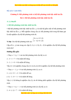 Đây là bản xem th , vu ử i lòng mua tài li u ệ đ xe ể m chi ti t ế (có l i ờ gi i ả ) B s ộ ách: Cánh Di u ề Chư ng I ơ I: B t ấ phư ng t ơ rình và h b ệ t ấ phư ng t ơ rình b c nh ậ t ấ hai n ẩ Bài 2. H b ệ ất phư ng t ơ rình b c ậ nh t ấ hai n ẩ A. Lý thuy t ế 1. H b ệ t ấ phư ng t ơ rình b c nh ậ t ấ hai n ẩ • Hệ b t ấ phư ng ơ trình b c ậ nh t ấ hai n ẩ x, y là m t ộ h ệ g m ồ m t ộ s ố b t ấ phư ng ơ trình b c ậ nh t ấ hai n ẩ x, y. M i ỗ nghi m ệ chung c a ủ các b t ấ phư ng ơ trình trong h ệ đư c ợ g i ọ là m t ộ nghi m ệ c a ủ h b ệ t ấ phư ng ơ trình đó. 2x y 0 (1) Ví d : ụ Cho h b ệ t ấ phư ng
