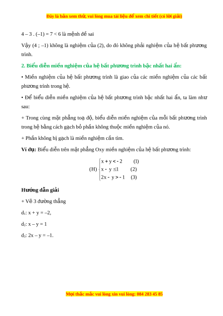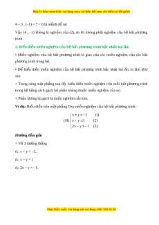 ậ (4 ; –1) không là nghi m ệ c a ủ (2), do đó không ph i ả nghi m ệ c a ủ h ệ b t ấ phư ng ơ trình. 2. Bi u ể di n m ễ i n n ề ghi m ệ c a h ủ b ệ t ấ phư ng ơ trình b c ậ nh t ấ hai n: ẩ • Mi n ề nghi m ệ c a ủ hệ b t ấ phư ng ơ trình là giao c a ủ các mi n ề nghi m ệ c a ủ các b t ấ phư ng ơ trình trong h . ệ • Để bi u ể di n ễ mi n ề nghi m ệ c a ủ hệ b t ấ phư ng ơ trình b c ậ nh t ấ hai n, ẩ ta làm như sau: + Trong cùng m t ặ ph ng ẳ toạ đ , ộ bi u ể di n ễ mi n ề nghi m ệ c a ủ m i ỗ b t ấ phư ng ơ trình trong h b ệ ng cách ằ g ch b ạ ỏ ph n không t ầ hu c ộ mi n ề nghi m ệ c a ủ nó. + Ph n không b ầ g ị ch l ạ à mi n nghi ề m ệ c n t ầ ìm. Ví d : ụ Bi u ể di n t ễ rên m t ặ ph ng O ẳ xy mi n nghi ề m ệ c a ủ h b ệ t ấ phư ng ơ trình: x y 2 (1) (H) x y 1 (2) 2x y 1 (3) Hư ng d ớ ẫn gi i ả + V 3 đ ẽ ư ng t ờ h ng ẳ d1: x + y = –2, d2: x – y = 1 d3: 2x – y = –1. M i