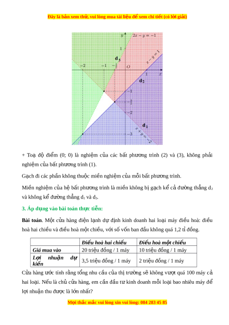 Gạch đi các phần không thu c ộ mi n ề nghi m ệ c a ủ m i ỗ b t ấ phư ng t ơ rình. Mi n ề nghi m ệ c a ủ hệ b t ấ phư ng ơ trình là mi n ề không b ịg ch ạ k ể c ả đư ng ờ th ng ẳ d2 và không kể đư ng t ờ h ng d ẳ 1 và d3. 3. Áp d ng vào b ụ ài toán th c t ự i n ễ : Bài toán. M t ộ c a ử hàng đi n ệ l nh ạ dự đ nh ị kinh doanh hai lo i ạ máy đi u ề hoà: đi u ề hoà hai chi u và đi ề u hoà m ề t ộ chi u, ề v i